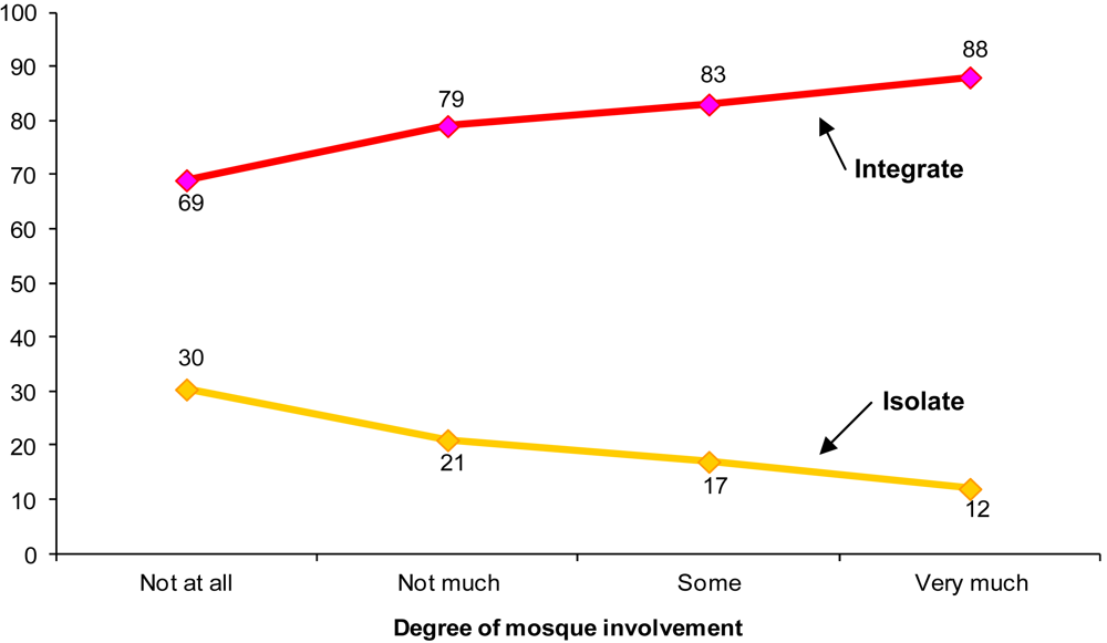 While these ideas of identity, commonality, and group-based resources are important, they are only the foundation of the process in which mosques may be associated with higher levels of integration and participation in American politics. Thus, we also asked respondents whether or not they believed mosques and Islamic centers help Muslims integrate into U.S. society, or keep them more isolated. Once again, we find a strong relationship between mosque involvement and support for integration. Among those who rarely or never attend their mosque, 69% feel mosques help integrate while 30% think they contribute to isolation (see Figure 4). However, as Muslims become more active in their mosque they become more likely to view the mosque as having an integrative effect in U.S. society. A full 88% of those who are very involved in their mosque agree that mosques help integrate as opposed to only 12% who think they contribute to isolation. Despite unfounded claims from those with little knowledge of Islam, we find very clear statistical evidence of a positive association between mosque involvement and support for mosques as centers of social integration in America. This finding is consistent with research on Asian Americans and Latinos, which find newcomers to America to be more quickly integrated and socialized through their churches [54-57].