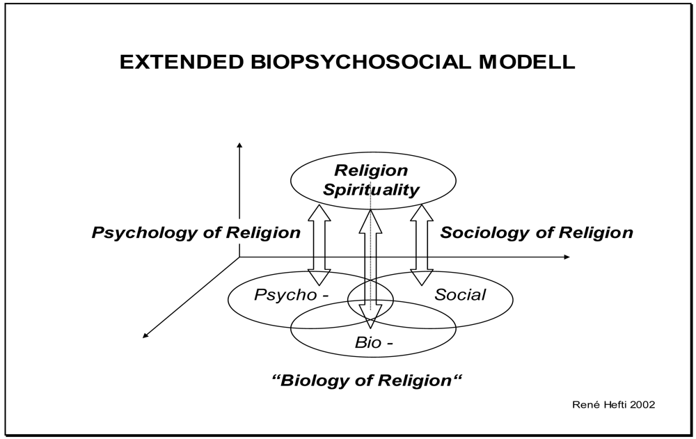 In psychiatry and psychosomatic medicine, the bio-psycho-social model introduced by George L. Engel in 1977 [16], is the predominant concept in clinical practice and research. It shows that biological, psychological and social factors interact in a complex manner in health and disease. In the extended bio-psycho-social model [17], religion and spirituality constitute a fourth dimension (Figure 1). This holistic and integrative framework is a useful tool to understand how religion and spirituality influence mental as well as physical health. Interactions with the biological, psychological and social dimension constitute the distinct disciplines of “biology of religion”, psychology of religion and sociology of religion. The extended bio-psycho-social model illustrates that a holistic approach in mental health has to integrate pharmacotherapeutic, psychotherapeutic, sociotherapeutic and spiritual elements.