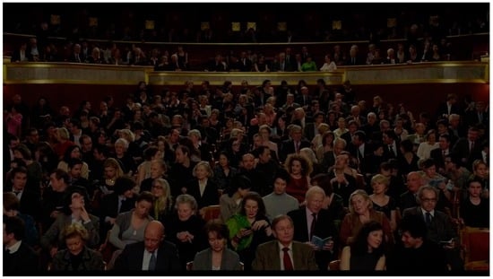 In Michael Haneke’s Cinema: The Ethic of the Image, Wheatley engages the same dilemma that many others experience: “Why, upon watching Haneke’s films, do we so often feel irritated, cross, even guilty?” ([], p. 5). This question led her to explore the ethics of spectatorship at work in Haneke’s films, and she discovered that the unsettling nature of his cinema stems from its dynamic of ethical reflexivity in the audiences’ experience. Her explorations of Haneke’s films then evaluate the link between the aesthetic reflexivity in the formal aspects of his cinema and the moral reflexivity experienced by his audience. Wheatley explains: “By placing reflexive techniques within new frameworks, I argue, Haneke is able to co-opt the spectator into a uniquely moral relationship to the film. Reflexivity in his films is used…to encourage a more open-ended reflection on the spectator’s part about moral questions. On the implicit level, the films prompt their spectators to ask: How are we complicit with the apparatus? What are the moral consequences of this?” ([], p. 5). In this way, Wheatley dubs Haneke “The Last Moralist,” and by this designation, she means that his decisive style prevents audiences from finding ethical resolution solely at the hands of the director. Instead, Haneke forces audiences to take responsibility for their own spectatorship and in his own fashion has prompted the evolution of filmmaking toward a new form of ethical cinema. One commentator describes the value of Wheatley’s project thus: “[W]e realize that Haneke’s oeuvre no longer reminds us of the satirical violence of Oliver Stone’s Natural Born Killers (1994) or Quentin Tarantino’s lack of morality in Inglourious Basterds (2009), but opens up a truly innovative strategy of looking at film as a philosophical tool that seems to dissect the audience’s attitude towards its morals layer by layer.” []. Consider for example the way in which spectatorship is acknowledged by the extended frame of the audience that Georges and Anne join for the concert in Figure 2. Here the spectatorship of the viewer is mirrored in the gaze of the concert audience starring back. From Wheatley’s assessment, this intervention in the formulaic ethics of Hollywood remains Haneke’s greatest moral contribution to cinema today.