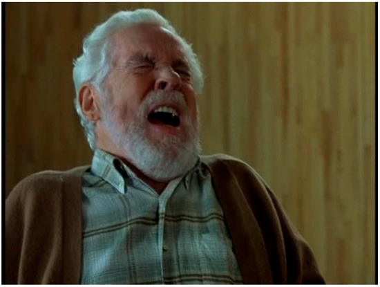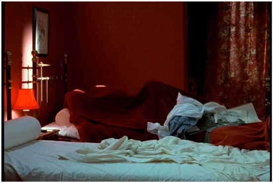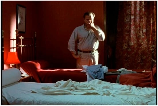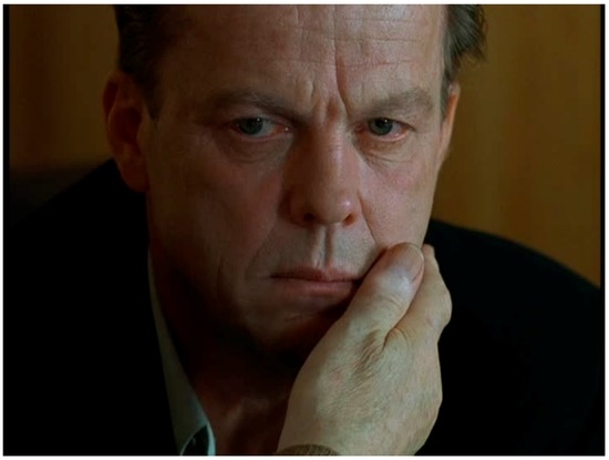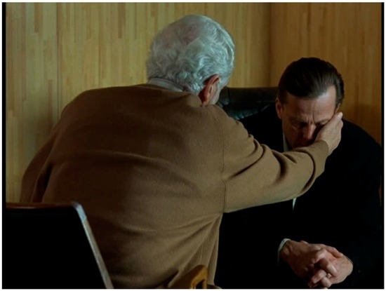 The only exception to the film’s introductory and valedictory silence is not the spoken word, but the sound of the child’s music box that plays in Bergman’s office near the conclusion of the film. The closest the film comes to some sort of reconciliation or expression of communion is in a powerful scene in which Bergman the director conjures the presence of David, his younger self. In every other scene in which David appears, he appears as part of Marianne’s narration. In this one instance, David is conjured by Bergman and appears as a persona existing temporally between the time of the action Marianne narrates and Bergman’s present. He confesses that he wishes he “could be sent to punishment”; instead, he has a strange “life sentence” from which he can “never escape”. At this moment, Bergman reaches out in a gesture of affection and gently touches David’s face. David then disappears and Bergman, in isolation, weeps (Figure 12, Figure 13 and Figure 14). Here physical touch, shown rather than verbally described, embodies the longing of the characters for compassion and re-union.