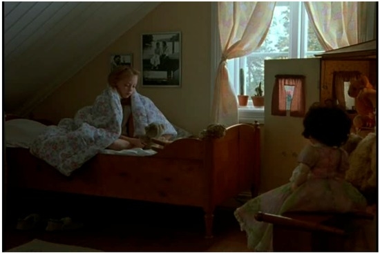 Pregnant with David’s child, she opts for an abortion. The physical and verbal abuse of Marianne is not, however, the most heart-wrenching sequence in the film. The film pivots on the scene where Markus confronts David and Marianne, a scene Marianne retrospectively describes as the beginning of the “tragedy“. However, the tragedy actually begins in the very next scene, when Marianne tells Isabelle that she’s leaving her and her father to live with David. Informed that she will have to stay with her grandmother, Isabelle plaintively asks why she can’t come live with David. Marianne sobs convulsively as she recalls the conflict within her, wishing to embrace and assure her daughter they’ll “always be together.” What she actually says is, “there’s no room.” Marianne’s internal sundering over the harm she knows she’s doing to her daughter is subtly intimated in the movie’s most exquisitely filmed scene. The audience sees Marianne doubled, both Marianne and her reflection in a mirror; then Isabelle appears, reflected in the mirror and seen from the audience’s perspective between the two images of Marianne (Figure 2, Figure 3, Figure 4 and Figure 5). As is true of this scene, so too throughout the film, the daughter appears in the film mostly in the background, typically alone in her bedroom where she overhears the virulent arguments of the adults. Her role is scripted perfectly to reinforce her status as an innocent victim of adultery and divorce. Bergman’s portrayal of the impact of adult vice on children has never been more dramatically expressed than in the script for Faithless. Music from a child’s music box, now in Bergman’s possession, begins and ends the film and accentuates the sense of innocence irrevocably lost.