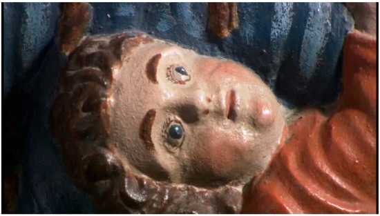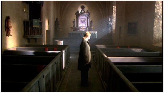 Heading down the aisle toward the exit, she stops, turns back around and faces the altar. As she does so, light floods in through a window in a descending diagonal and bathes her in light. Marianne concentrates her attention on a porcelain tableau of the Last Supper at the center of which is the beloved disciple John reclining upon Jesus. Eyes still focused on the Last Supper, she makes a gesture of prayer (Figure 18, Figure 19, Figure 20, Figure 21 and Figure 22). Here is precisely the note of divine love and communion that is so often absent in Bergman’s films.4 It also seems to move beyond what Bergman described as the conflict between his childhood piety and the harsh rationalism of adult life. The appearance of an encompassing light is significant. As William Desmond observes, nihilism makes the light itself strange. Were nihilism the ultimate truth, we would expect no light, and yet there is light. We see the “truth” of nihilism in a light that nihilism, were it true, would render impossible? What is that light? Is it something in which we are, in the more primal ethos of being, which we do not bring to be, but rather we are simply what we are as participants in it ([16], p. 33)?