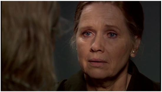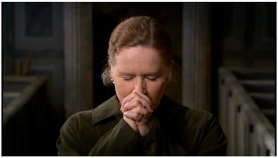 Marianne’s prayers, or at least her intentions to bring reconciliation between family members, are not answered, at least not the way in which she intends when she stands in reverence in the chapel. In the epilogue, as she again peruses photographs, she says she tried to stay in contact with Johan but that he gradually quit responding. We might say that he slipped away just as Martha is described as doing. However, his slipping away is volitional, a species of conscious avoidance. The themes of isolation and absence are prominent in nearly all Bergman’s films. The retreat to the margins of the human community has complex sources. In this film, it is clear that the catatonic daughter Martha suffers an extreme form of what all human beings suffer to varying degrees and what we all potentially suffer at any moment. However, she does not represent simple absence. Indeed, in this film, the two most influential characters are never present in the ordinary sense in which we use the term: the first is Martha, while the second is Anna, the beloved and deceased mother and wife, who exercises an influence over all the other characters. Reflecting on Anna’s love, Marianne is prompted to visit the other absent character, her daughter Martha, whose face she touches for the first time. In their wordless silence, there is an intimation of love and communion (Figure 23, Figure 24 and Figure 25). There is rich material here, I think, for rethinking the notion of disability in a theological light. Communion here is not an abstract idea or an object of discussion; it is not so much said as it is shown in the ritual practice of human touch, a gesture of affection.
