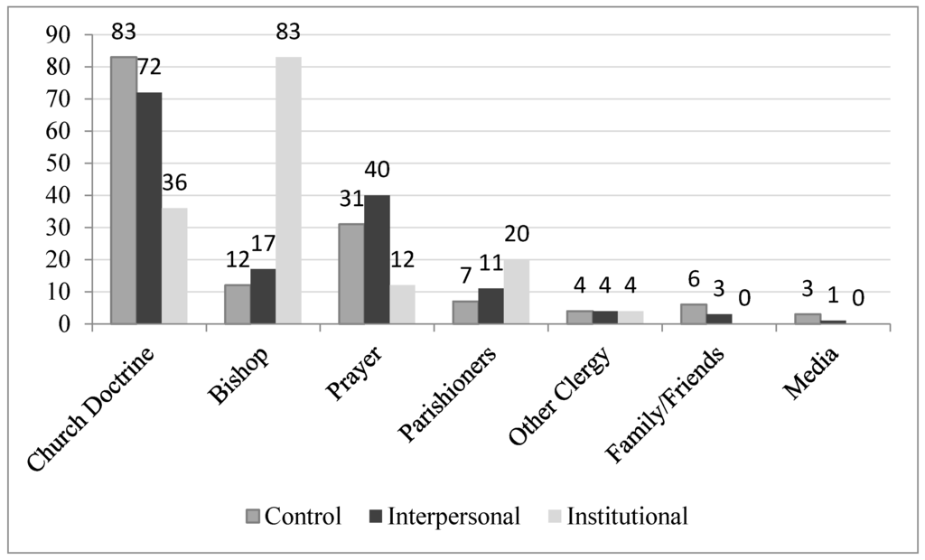 The cue selection is somewhat different when examining priest self-reports according to their assigned primes. Among the subjects randomly exposed to the Interpersonal Prime, Church doctrine is the most frequently indicated first cue choice (72 subjects). However, rather than look to bishops as the second most frequent cue source, “prayer” was actually the second most relied on cue among those encountering the Interpersonal Prime (40 subjects). This finding is in line with the expectation that referencing clergy fatigue in the prime reduces priest attention to reference groups and associated concerns.