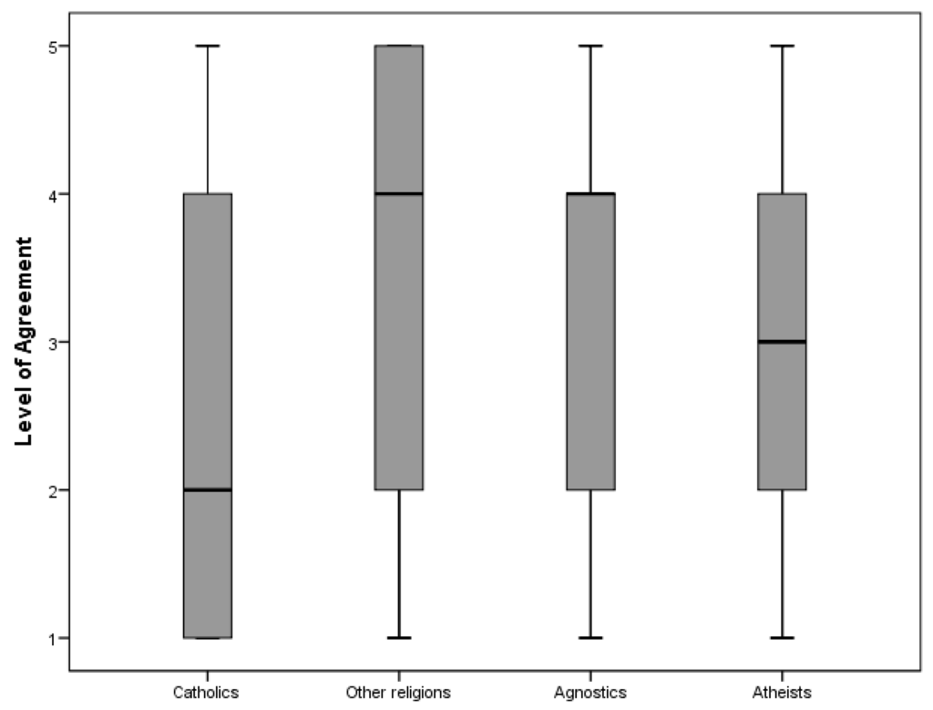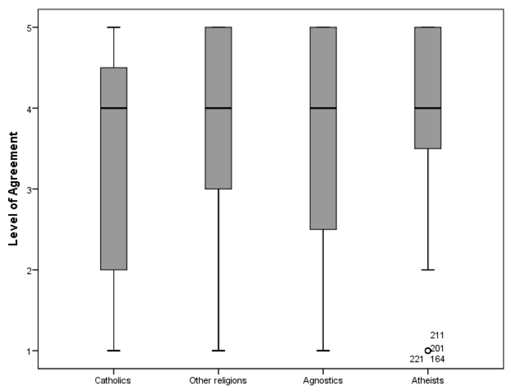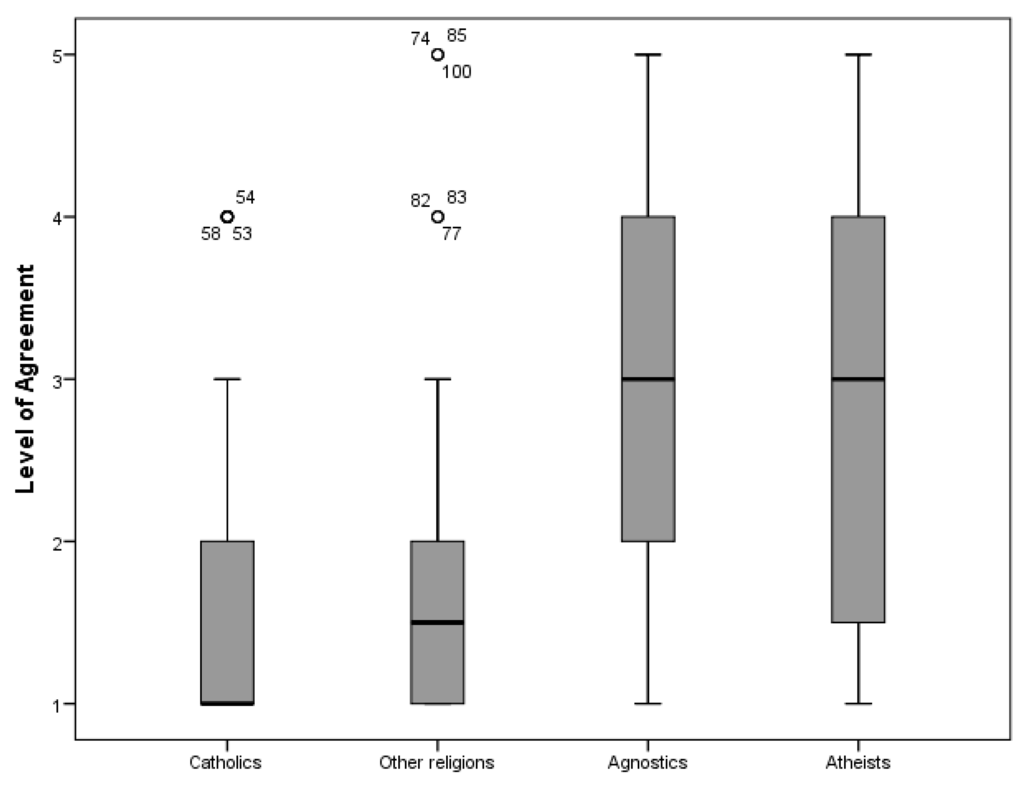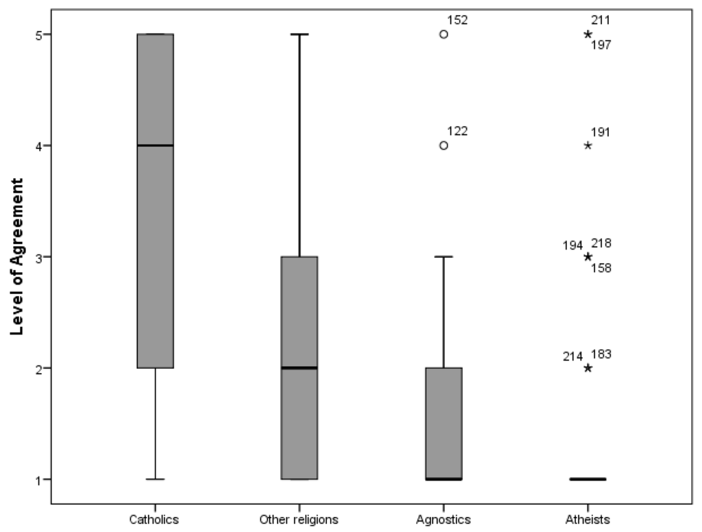 The opinions were mostly against human cloning (total average 2.45: Figure 4), with stronger opposition among Catholics (average = 1.83) and believers in other religions (1.97), and a greater tendency towards agreement among non-believers (2.89) and atheists (2.90), although still below the acceptance threshold (=3). Outliers within the religious believers were also found in this issue.