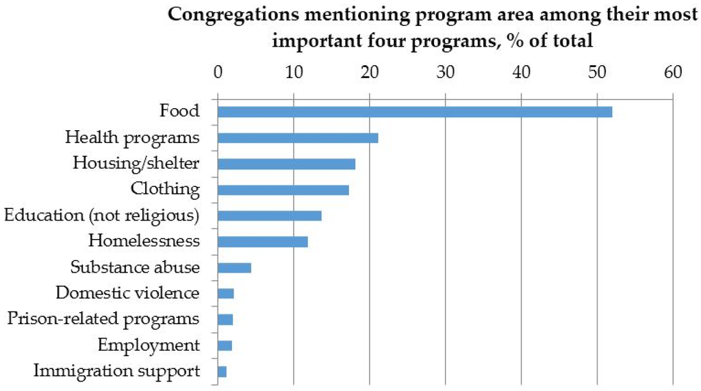 In this article we focus on congregations’ social service activities. Research and writing on this subject in the midst of the Faith-Based Initiative was shaped by the policy debate, with those sympathetic to the initiative emphasizing the extent of social services performed by congregations and how much more they might be capable of doing, while those unsympathetic to the initiative emphasized how little social services congregations did, and the limits of what they reasonably could be expected to do [4,5,6,7,8]. With the fading of the Faith-Based Initiative, it now is clear that the policy debate obscured a fair degree of consensus concerning the basic facts about the extent and limits of congregations’ social service work. Here we use data from the 2012 National Congregations Study to describe several key features of congregations’ contemporary social service activity.