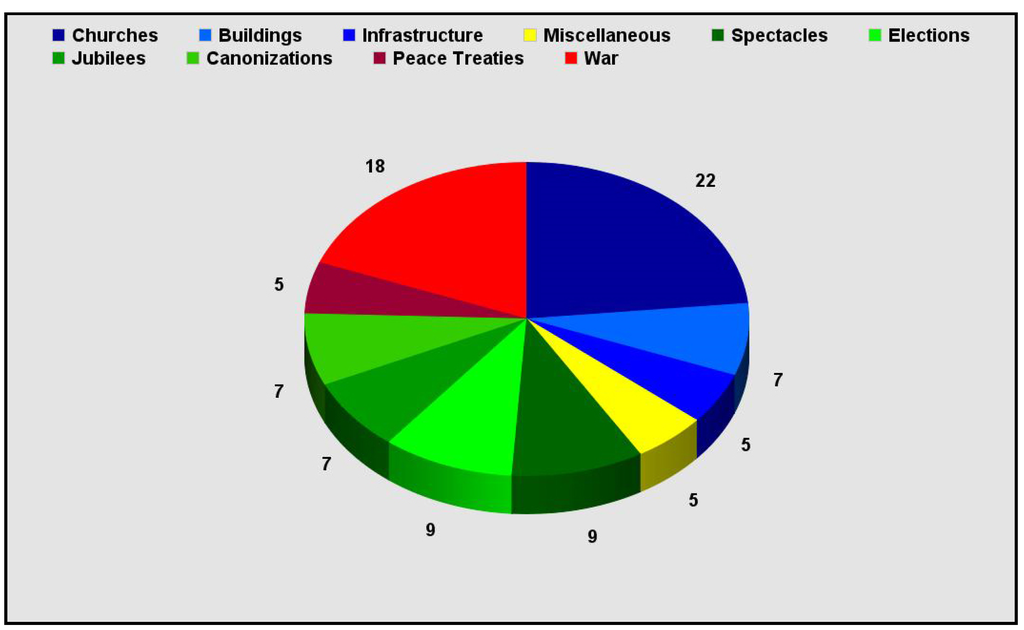 The medals can be divided into three broad groups: architecture, war, and spectacles (see Figure 1 and Figure 2; see also Appendix). For greater specificity, these groups can be subdivided into smaller categories. There is overlap: for example, Urban VIII’s renovations on the Palazzo Quirinale are architectural, but are also military improvements. There are also five annual medals with generic images, which are included in the chart under the heading “Miscellaneous”: This group includes three medals depicting Peter (1607, 1694, and 1698) and two showing female personifications of the Catholic Church (1680 and 1683). Finally, Sede vacante produced two more miscellaneous medals that were not counted in this survey because they lacked a papal patron and thus the political agenda (if any) remains obscure.