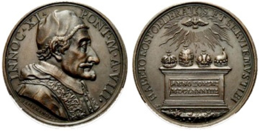 European powers and the Ottoman Empire continued to war throughout the seventeenth century, and this ongoing conflict produced medals with some of the most militant messages of the seventeenth century. Under Innocent XI (r. 1676–89), eight of thirteen annual medals dealt with military matters. Innocent’s reign fell within a span of twenty-one years in which thirteen medals were dedicated to war. This corresponds to the papacy’s escalating prosecution of the Great Turkish War, a conflict between European superpowers and the Ottoman Empire that occurred broadly between 1681 and 1700 ([35], pp. 286–327). Innocent initiated a new Holy League in 1684, and commemorated this achievement in that year’s annual medal (Figure 4). The reverse shows the members of the new League represented by crowns arrayed on an altar: from left to right, Holy Roman Emperor Leopold I, the Papal States under Innocent XI, Polish King John III Sobieski, and Venetian Doge Marc Antonio Giustiniani.