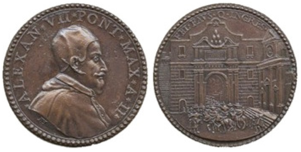 Alexander VII was a builder and his reign was a period of major construction programs. The grounds for his well-earned sobriquet “Papa di grande edificazio” can be seen in his annual medals: seven of his twelve commemorate building projects. By the end of Alexander’s reign in 1667, the grand vision of Rome imagined by Nicholas V two centuries earlier had been realized through the combined efforts of over thirty popes, and Alexander’s additions were the crowning achievements ([21], p. 85); see also References [22,23]. Yet his building campaigns contributed in no small part to the dire financial straits in which the papacy found itself at the end of Alexander’s reign ([24], pp. 171–72). After Alexander, major architectural expenditures diminished to a trickle as the papacy flirted with bankruptcy and new priorities emerged in the 1670s, particularly the perceived threat of a Turkish invasion ([25], p. 291).
