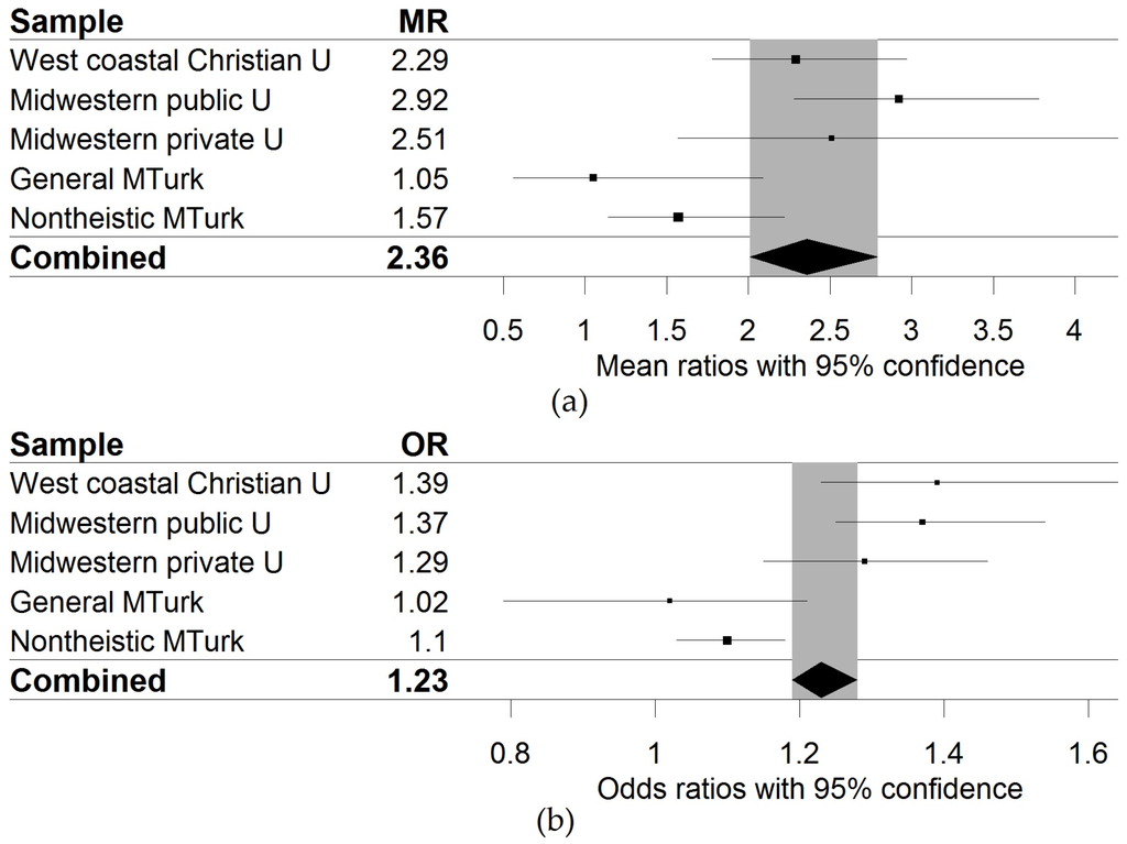 (a) Forest plot of ratios of mean equal responses if attention check is failed vs. passed; (b) Forest plot of odds ratios for attention check failure per equal response. Combined N = 2697; MR = mean ratio; OR = odds ratio; U = university.