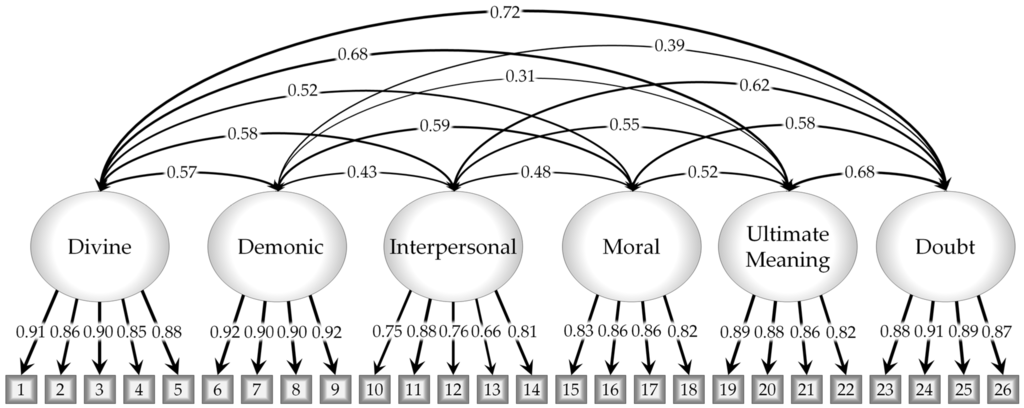 Exline and colleagues [19] found good fit statistics for the first-order measurement model of the RSS’ six correlated latent factors in confirmatory factor analysis (CFA). Nonetheless, these analyses left some room for doubts. Primarily, the latent factor model did not test the viability of a second-order factor corresponding to the total RSS score. Strong correlations among the first-order factors (rs = 0.31–0.66, median = 0.51) build evidence for a second-order factor that could represent R/S struggle in general, but a CFA of this model can more precisely quantify support for any single factor that affects all six dimensions of the RSS, which could also include religiousness or distress. Secondarily, model estimation and evaluation methods did not accommodate the ordinal measurement of skewed latent distributions inherent in the design of the RSS and the nature of R/S struggles, which are rarely severe, especially in non-clinical populations [20,21].