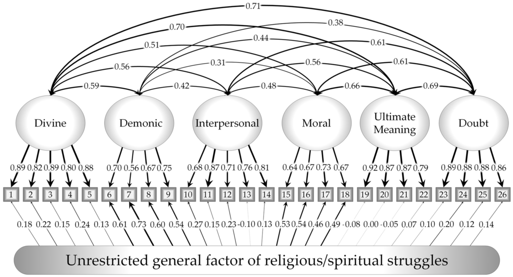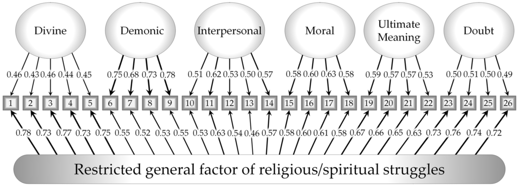 The RSS provides an especially intriguing opportunity to investigate the psychological implications of a bifactor measurement model. As a newly explored set of psychological constructs, the RSS has yet to resolve its placement in the overlapping domains of distress and religiousness/spirituality. Thus far, the Demonic, Moral, and Ultimate Meaning subscales have exhibited stronger relationships with religiousness than the Divine, Interpersonal, and Doubt subscales, whereas relationships with depressive symptoms, anxiety, anger, and loneliness appear relatively consistent across all subscales [19]. The unidimensional or second-order models of the RSS produce a total score that correlates more strongly to these measures of mental health than to religiousness, unlike the Demonic and Moral subscales. All these correlations are positive, yet Ultimate Meaning struggle correlates negatively with religiousness.