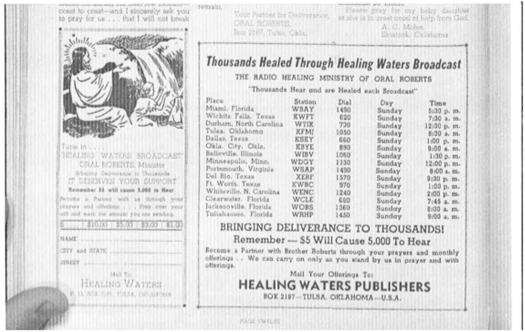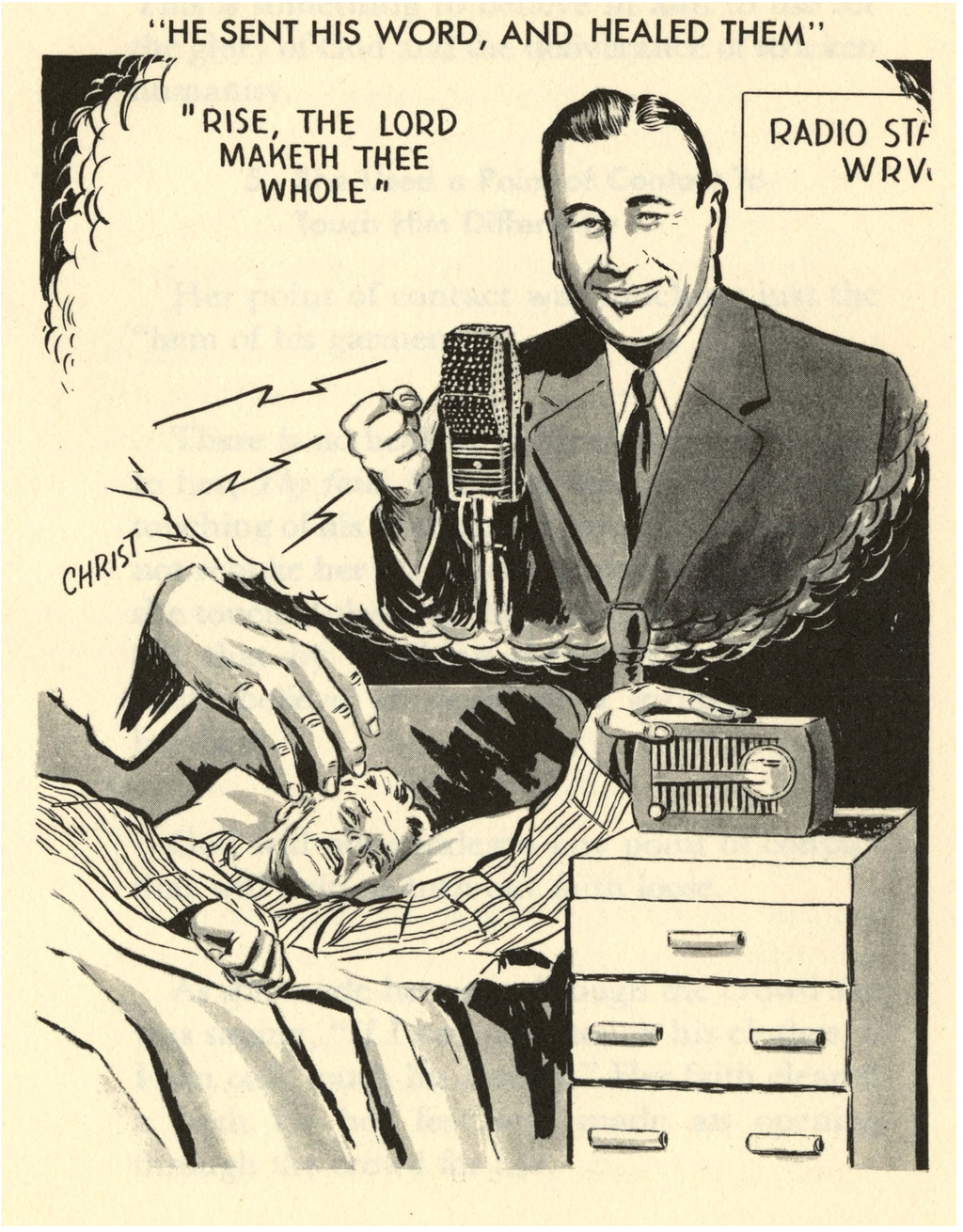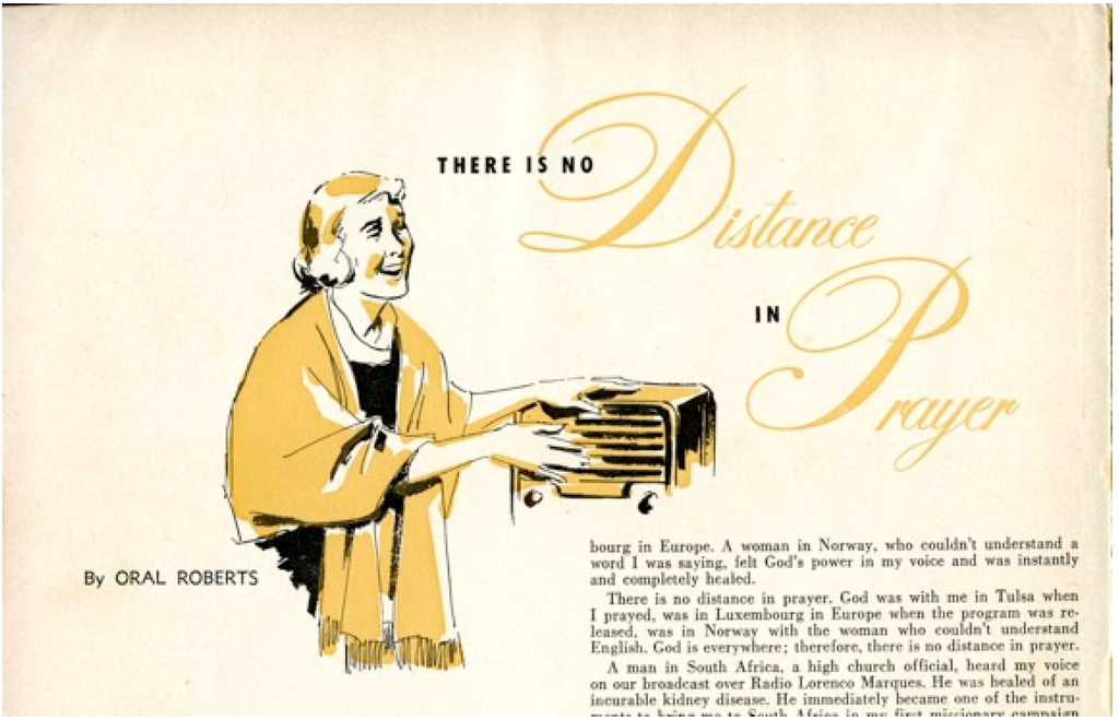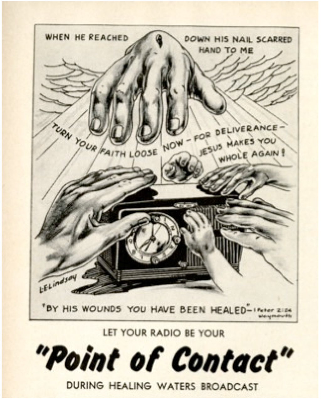 Once again, it is not mere coincidence that Roberts was constantly invoking metaphors of technology to describe the point of contact, as the first explicit formulation of this new prayer-gesture emerged within the context of his popular radio broadcast. In his article entitled, “The Story Behind Healing Waters,” Roberts explains the basic ideas behind the radio as a point of contact:
