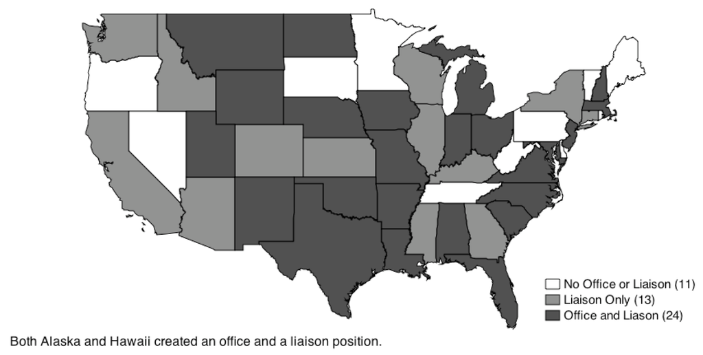 - 2Currently, 23 of these states still have offices; however, it is unclear how many still have liaisons since many liaisons are in a variety of government offices, and the White House is no longer tracking which states have liaisons.