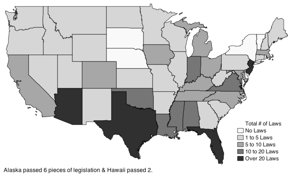 State legislation by year. Number of faith-based laws passed by Year (1996–2009).