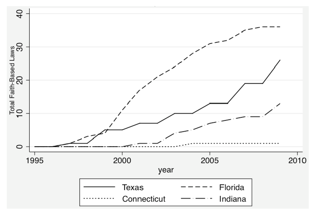 Cumulative count of faith-based legislation for selected states, 1995–2009.