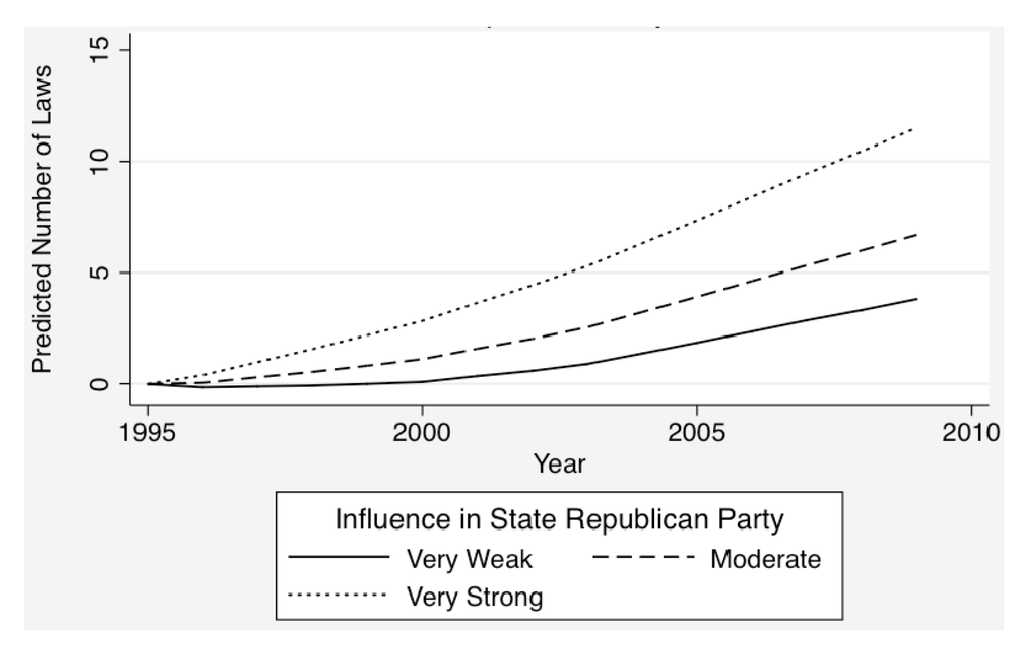Predicted cumulative faith-based legislation for states containing Christian right social movements with weak, moderate, & strong influence within the State Republican Party