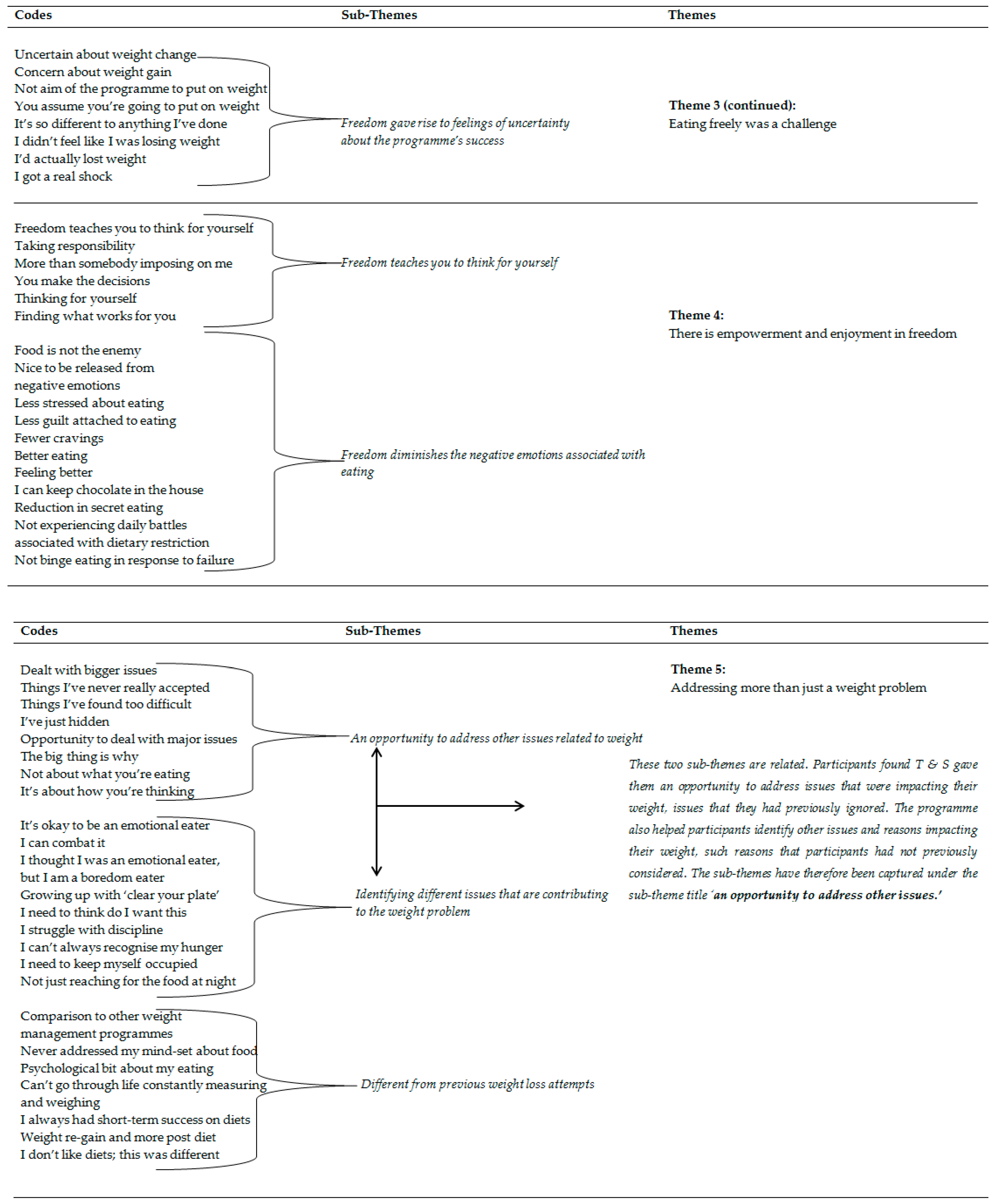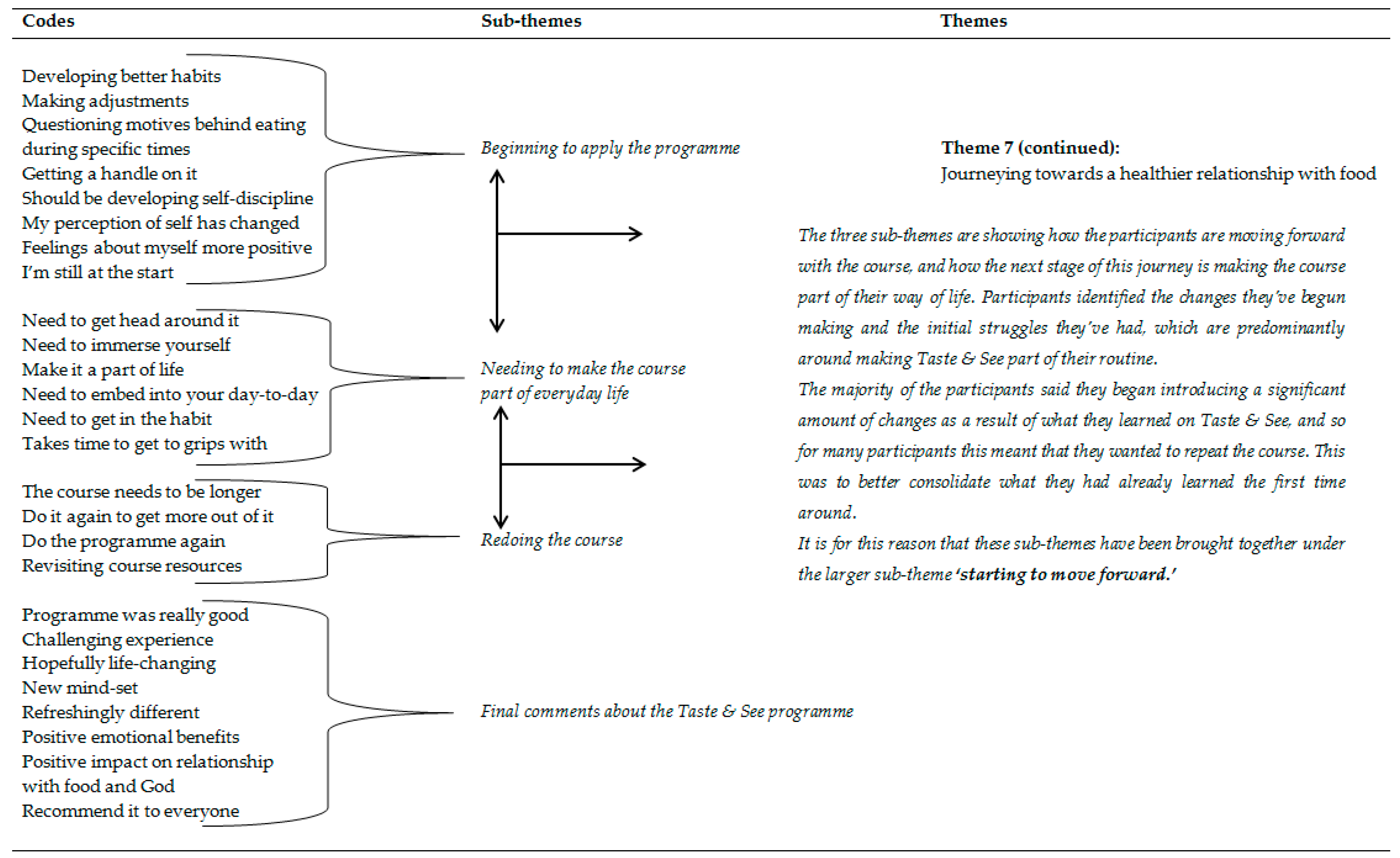 The development of codes into sub-themes and themes is illustrated in Figure 1.“I was in a much worse place than I actually really thought I was, and I recognise that I needed to address it [and] I found it hard to address it…Spirituality and education about healthy eating works.”[Extract 44, Participant 15]