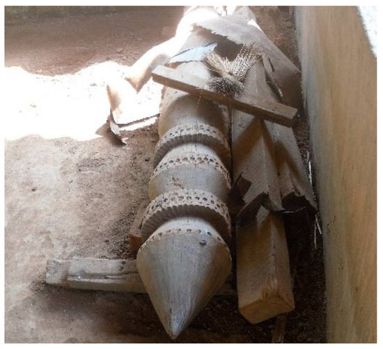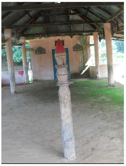 Below are a few pictures from the Tiwa village. Figure 1 is the temple where the Tiwa Totem is housed. Figure 2 shows the Totem laying on the floor, which meant the king is currently present in the village. Figure 3 shows the Totem being raised, which stands for the King being away. The Totem is believed to be presiding over matters in the King’s absence. Photo by the author.