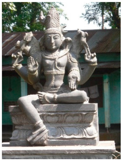 In reference to antiquity, Kāmākhyā surpasses most of the shrines in larger India and definitely in eastern India. Kāmākhyā dates to the eighth century and continues to be one of the oldest and most revered of the early seats of goddess worship. This temple complex also epitomizes the retention of many ancient practices: “The śākta pīṭhas in general and Kāmākhyā in particular represent a complex interaction or negotiation between main stream Brahmanical or brāhmaṇic traditions and indigenous elements from the pre-Hindu areas of India” (Urban 2010, p. 32). The temple is believed to be first built in 1487 C.E. and then rebuilt in the sixteenth century (Banerji 1992, p. 147). Additionally, a unique feature of the larger temple complex of Kāmākhyā is that all the ten mahāvidyās, or “wisdom goddesses,” have a temple dedicated to their own practices as well as a temple dedicated to Śiva and Viṣṇu respectively6. Further, none of these goddesses are represented in imagery. They are all worshipped on sacred rocks in which it is believed the goddess resides.