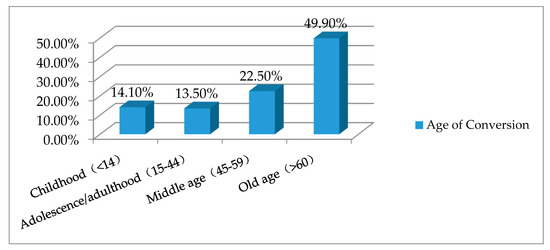 First of all, females take up a greater proportion in urban Christians. In our survey, the proportion of women in the Christian community was as high as 58.12% and the male was 41.88%. In contrast, the proportion of women was 51.36% in the group without any religion, the proportion of males was 48.64%. We found that, first, women are more likely to be influenced by family and friends and believe in Christianity. Considering the research samples (see Figure 3), the main reasons for urban residents to believe in Christianity are influence from religious family members, and the illness of their family members and their own. We intend to provide an explanation for the higher proportion of female Christians through the analysis of relationships between gender and religious family members, and between gender and chronic diseases. In the analysis, we divided the samples into male samples and female samples, and made a variable for these two groups of “before you believe in Christianity, whether your family or friends believe in Christianity” with the variable “whether they believe in Christianity”. Correlation analysis showed that the correlation coefficient of female samples was 0.89, while the correlation coefficient of male samples was 0.77. It indicates that women are more susceptible to family and friends’ influence. Second, when suffering from disease, compared with men, women are more inclined to pray to God to ease the pain. When we analyzed at least one group of chronic diseases, we found that the proportion of male’s belief of Christianity was 3.03%, compared with 3.41% for women: more women than men. In the discussion with the participants we also found that especially when chronic diseases cannot be completely cured, women are more likely to turn to faith to reduce the pain. This is also the case when the family or himself is suffering from a major disease that cannot be cured. Six women among all interviewees suffer from chronic disease, and four of them claimed that they converted to Christianity after being diagnosed with diseases such as diabetes and arthritis, in the hope that their pain could be eased.