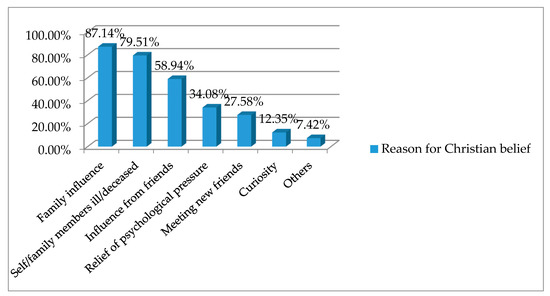 Figure 2 addresses the cause why people become a member of Christianity. The highest influence is from family, 87.14%. Additionally, one who is, or whose relatives are, diagnosed with a disease, or suffer from the death of family members are more committed to Christianity; 79.51% of the participants fall into this category. Other possible reasons are pressure relief, expanding social networks, and curiosity. Families and friends make a difference on the selection of faith, as does one’s health condition.