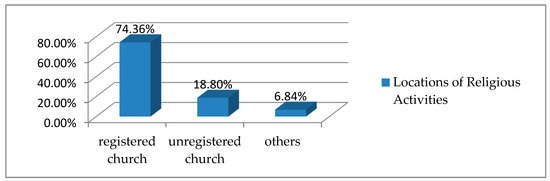 Figure 4 shows the location of the city’s religious activities. There are two main types of places where Christian believers carry out religious activities in mainland China. One is Christian churches registered at National College of Three-Self Patriotic Movement of the Protestant Churches in China (abbreviated as “National TSPM”) and the Chinese Christian Council (abbreviated as “CCC”), referred to as the registered church. The other is a church that is not registered under the National TSPM and the CCC. They usually carry out religious activities in the form of family gatherings, with more locations are in the private house. The survey showed that 74.36% of the religious activities were carried out at registered locations and 18.8% of the religious activities were carried out at unregistered locations. Those who are not clear whether where their religious activities took place were registered take up 6.8%.