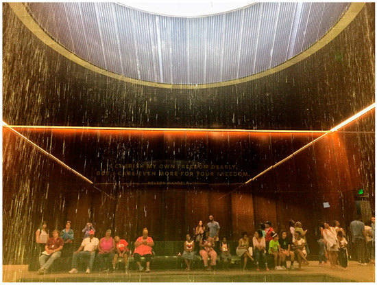 Barbara Holmes, who has examined contemplative practices of the black church, notes that for African and African American people, contemplation can take individual or communal forms. Communal practices of contemplation, she explains, are about orienting the gathered community and unifying them with a shared vision of the work of the Divine. She writes, “Contemplation in Africana contexts is an act of communal reflection and reflexive engagement with both knowable and unknowable occurrences. In communal settings, it is the confluence of atomistic experiences and reflection grounded in a shared interpretive process” (Holmes 2004, p. 46). This element of spirit in contemplation and in the NMAAHC contemplation court’s design is ultimately oriented to the shared work of interpreting their realities. The communal spirit is a key element of the third principle, healing, to be discussed below.