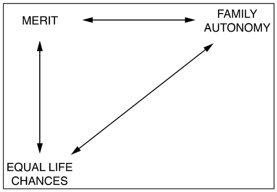 According to James Fishkin, when two assumptions about equal opportunity (the principle of merit and equality of life chances) are combined with a third assumption (autonomy of the family), “a pattern of difficult choices emerges”, whereby “commitment to any two of these assumptions rules out the third” ([21], p. 5).