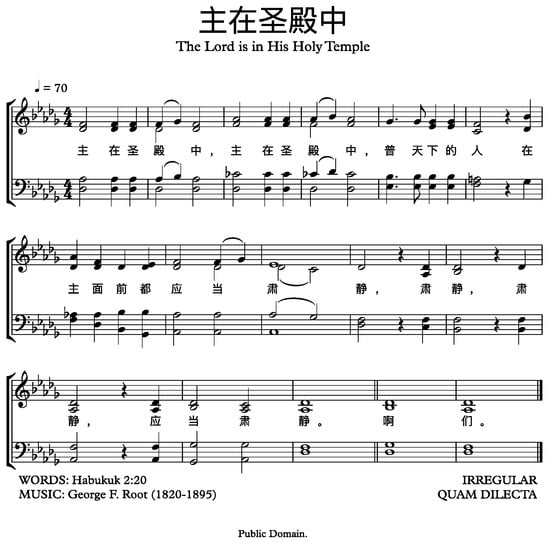 In the context of mainland China, foreign lyrics are translated into Chinese; these translations are matched with the original foreign melody, and then sung. An example of this would be George Root’s “The Lord Is in His Holy Temple (主在圣殿中)” (Figure 1). This work continues to be widely used by Chinese Christian communities in mainland China and beyond, even though it is hardly sung in the land of its origin. Other popular works in this category include John Newton’s “Amazing Grace,” Stuart Hine’s translation of “How Great Thou Art,” and contemporary worship songs like Rick Founds’ “Lord, I Lift Your Name On High” (1989) [17], Tim Hughes’ “Here I Am to Worship” (2001) [18], and Chris Tomlin’s “How Great Is Our God” (2004) [19].