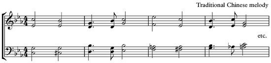 This next stage of contextualization is marked by musicking using local melodies. These tunes often are affixed with Western harmonization. The Adapted Song is an effort to embrace local expression, to break the inherited potted Gospel and plant it in local soil. However, with Western musical practices still being highly esteemed, musicking in this stage of contextualization is a juxtaposition, often treating a local melody that is typically monophonic with four-part homophonic arrangement or in other Western popular musical nuance (Figure 2). Typically speaking, the architects for this song type, however, are locals who are skillful in music creation. In China, well-regarded retired pastor and eminent Chinese church music personality Rev. Shi Qigui would be an example ([21,22]).
