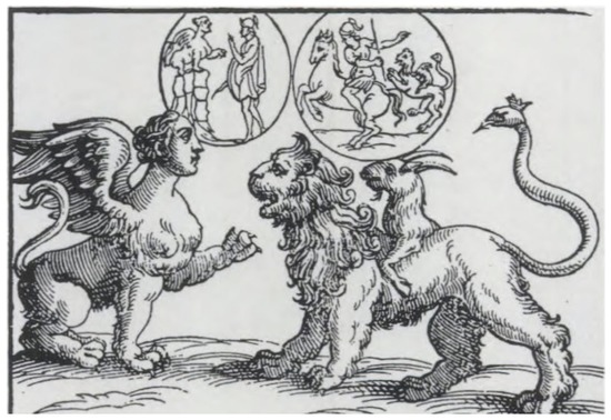 Mythologiae (1567) glosses Chimaera as a representation of the arts of rhetoric ([