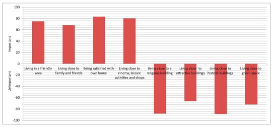 Part of the questionnaire also aimed to identify what factors youth consider to be important when considering what makes an area a good place to live. In terms of considering the factors as listed by () the majority of participants (68%) felt that living close to family and friends was very important. Living in a friendly area was classified as important (75%) along with being satisfied with their own home (83%) and living close to cinema, leisure activities and shops (80%). However, in terms of associations with religious buildings, being close to a religious building was classified by the participants as slightly unimportant (37%) or unimportant (51%) with a minority of 12% considering close proximity to a religious building to be an important or very important factor in making somewhere a good place to live. A positive link was identified between youth who frequently attended a religious building and those who felt it was important or very important to live close to a religious building. The youths also classified living near attractive buildings (66%), historic buildings (89%) and surprisingly green space (72%) as slightly unimportant or unimportant (Figure 2). The questionnaire also identified that the majority of respondents (82%) stated they had not visited an historic building in the past year either in or out of school.