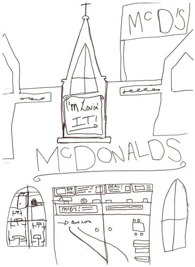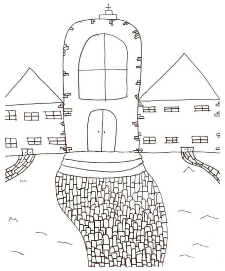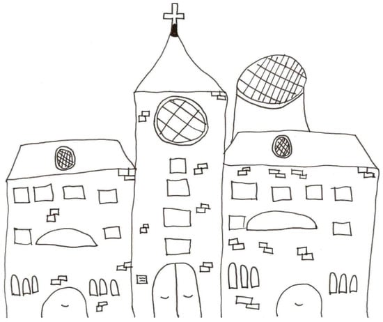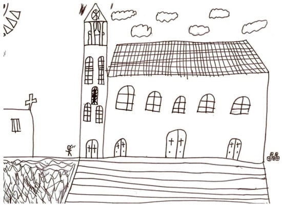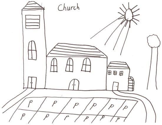 The drawings produced during the workshop were of an excellent quality and contained a mixture of elevation and floor plan representations. Overall, the youth participants appeared to adopt natural drawing techniques relatively typical of their age range; using single lines and simplistic plan views. They utilised the basic elements (walls, windows, doors and roofs—i.e., archetypes) to demonstrate their expectations. Basic geometrical primitives for example squares and circles were also used. The external space or facade of the building or indeed its location did not seem to be of any significance to the young people, with the exception of using it as a natural way of describing the building. Notably, the youth participants demonstrated confidence when drawing a typical church building, with no participants asking for help with this task. Expectation drawings of a typical church building were generally well-composed elevation drawings and were strong in terms of religious symbology, including crosses, stained glass windows, bells and spires (Figure 3). Facades were either blank or decorated with stonework. Proportionality and balance was apparent in all of the drawings (Figure 4). Main entrances to the church buildings were also clearly evident, with pathways and steps drawn to signify importance (Figure 5). In total, 51% of the drawings considered the landscaping of a church building with the inclusion of graveyards, trees, grass, access roads, and car parking spaces (Figure 6). Text was also evident in some drawings (20%), mainly of a biblical content.