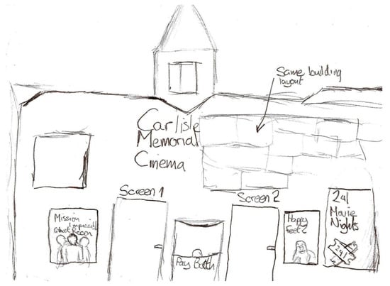 The responsive drawings also provided a mixture of external facade and floor plan interpretations. Regardless of proposed use, the facade of the building remained intact, perhaps demonstrating a respect for the current building’s architectural form (Figure 7 and Figure 8). Aspects of religious integration was also evident in drawings, possibly indicating that the building’s previous religious association was no longer relevant and that shared community relations is viewed as important by this age group. Another interesting aspect of the responsive drawing task was that a clear respect for the building’s past was evident. Despite the many reuse options provided during the workshops, 86% of the participants felt it important to indicate a distinct space in their drawings in which to commemorate the Carlisle family. This suggests the workshops were useful in enabling the local youth to develop a connection to the building through its story of development. Other interesting re-use options provided by the youths included a gymnasium, dinosaur museum and art centre.