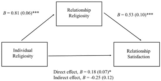 The third hypothesis predicted that relationship religiosity would mediate the relationship between individual religiosity and relationship quality. The results for this analysis are presented in Table 3. Our hypothesis was partially supported. Relationship religiosity fully mediated the relationship between individual religiosity and relationship satisfaction (see Figure 1). From this figure, the path between individual religiosity and relationship satisfaction becomes insignificant when relationship religiosity is included as the mediator. However, relationship religiosity did not mediate the relationship between individual religiosity and commitment. Yet, relationship religiosity was positively associated with commitment for this model. For these models, the changes in R2 for relationship satisfaction (ΔR2 = 0.12; p < 0.001) and commitment (ΔR2 = 0.04; p < 0.05) were significant. The variance explained for the mediational model for relationship satisfaction was 15% and 8% of the variance was explained for the mediational model for commitment.