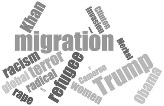 Anti-Islam statements are often paired with references to ethnicity, gender, and politics. Figure 2 represents a word cloud of the terms that are most frequently used in the tweets, excluding those that are not relevant for the analysis (such as prepositions and conjunctions). Each term indicates a semantic area, for example “migration” includes references to migrants and immigrants, too. As the figure shows, many tweets—combined, 21% of the dataset—refer to migration or refugees, which are usually negatively talked about as causes for the growth of Islam. There are also frequent mentions to politicians, found in 31% of the dataset: the majority of these tweets talk about Donald Trump, but there are also references to Muslim London mayor Sadiq Khan, then US president and presidential candidate Barack Obama and Hillary Clinton, and German chancellor Angela Merkel. These references show that the tweets discuss politics globally, often identifying left-wing politicians as Muslim allies, and praising right-wing politics for being anti-Islam. Islamophobic discourses in the tweets are further enhanced by numerous mentions of terrorism, radicalism and rape, generally used to connote Islam as violent and backward. In so doing, many tweets perpetuate closed views against Islam, as in the Runnymede Trust’s definition (Runnymede Trust 1997).