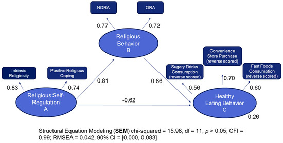 One-way straight arrows connecting the three latent variables into a triangle are accompanied with numbers denoting standardized regression coefficients (βs), which can be used as effect size estimates. For purposes of explanation, letters, A, B, and C, are designated to represent the religious self-regulation skills factor, the religious self-management behaviors factor, and the healthy eating behaviors factor, respectively. Thus, the strongly positive effect of A toward B (β = 0.81) indicates the more religious self-regulation skills one has, the more engagement there is in B, religious self-management behaviors. Likewise, the positive effect of B towards C (β = 0.86) indicates that higher engagement in religious self-management behaviors produces more healthy eating behaviors. However, A is inversely correlated to C, with a strongly negative A toward C effect (β = −0.62). The model also indicates religious self-management behaviors serve as a moderating factor for healthy eating behaviors. A total of 26% variance in healthy eating behaviors is accounted for by this model.