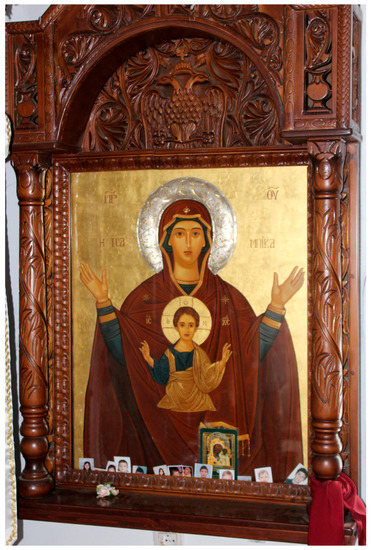 The circulation of the story of Neilos indicates how this icon is now used by Orthodox faithful. It became one of the most venerated not only in the monastery, but its fame spread in the rest of Orthodox Greece, Russia, Finland, Serbia, Romania, Bulgaria, and other places (Figure 2). It is also venerated in diasporic Orthodox churches now. In all these places, it is the icon that some turn to first when in urgent need or in distress. For many women, “She Who is Quick to Hear” is the one who understands a mother’s pain, worries, and joy, but also as the Heavenly Queen with invisible powers who may intercede and act on her own. Therefore, as the troparion says: “With faith crying out from the depths of soul, swiftly hear our prayers, O Virgin, for Quick to Hear you are named” (Akathist-S 2013, p. 14).