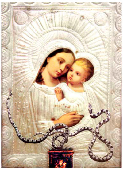 The “Virgin of Snakes” is found in the small Greek village of Markopoulo in south Kellafonia. According to oral tradition preserved by the villagers, and now maintained through Orthodox publishing and social media, a miracle occurs every year after the feast of the Transfiguration, celebrated on 6 August. Around the bell-tower of the chapel, built on the ruins of an old convent, small venomous snakes appear. These snakes crawl around the church and “venerate” the icons of the Theotokos, turning harmless so that people often take them in their hands (Sanidopolous 2009).