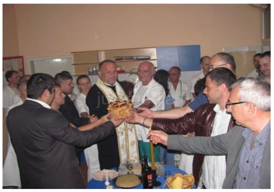 As we have mentioned several times, a widely present phenomenon in all institutions in Serbia and Republika Srpska is the celebration of “Slava”. Municipalities, theaters and health centers have their own Slava celebration. This is a ritual related to the practice of the Serbian Orthodox Church, one indeed specific even with regard to other Orthodox churches. Only those who have been baptized can participate in the ritual proper, while all people present can be served the meal afterward. Since the cutting of the ritual bread, seen performed in Figure 1 and Figure 2, takes place in public institutions, it is obvious that citizens who are not members of the Serbian Orthodox Church are excluded from this particular part of the event.