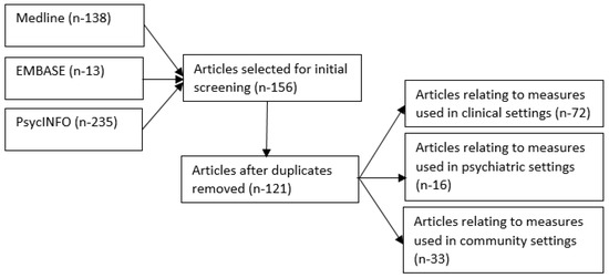 Using the above search protocols, we located 386 articles relating to the use and validation of measures evaluating spirituality and religiosity/religious beliefs in a variety of settings. We then selected articles for initial screening that related to the development, validation and subsequent use of self-reporting measures specific to spirituality, spiritual well-being, spiritual distress, spiritual needs, religiosity and religious beliefs (n-156). After removing all duplicates, 121 articles were selected for further evaluation. Of remaining articles, 72 investigated spirituality and religiosity in clinical settings, 16 in psychiatric clinical settings and 33 in social settings (Figure 1). Overall, we identified 25 measures used in a variety of clinical settings and 30 measures used in psychiatric, theological and social settings. For the purposes of this study, we shall briefly review measure of spirituality, spiritual well-being, religiosity, religious beliefs, spiritual distress and spiritual needs used in clinical settings (Table 2 and Table 3).