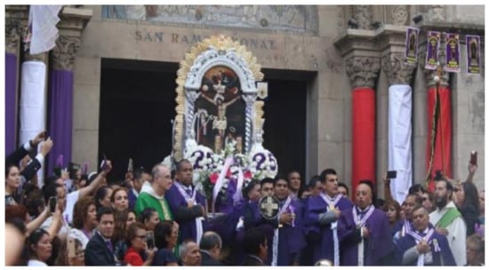 To examine the history of the procession of the Lord of Miracles, we must go back to 1650, when the Viceroyalty of Peru was ruled by Viceroy García Sarmiento Sotomayor and the Archbishopric of Lima was held by Pedro de Villagomez. That year, a group of people of Angolan origin formed a guild or brotherhood and established a meeting place in the outskirts of Lima, in the Pachacamilla area. The story, tinged with legend, goes that an Angolan slave surnamed Dalcón made a rustic painting of the image of a crucified Christ on one of the walls of the premises. In 1655, a major earthquake shook the city of Lima, destroying much of the city. All of the adobe walls of the guild’s premises collapsed except the one where the image of Christ was depicted. The legend recounts that it remained completely intact, without even the slightest crack. Since then, the image of this Christ has been an object of devotion for people of African origin in the area and its environs (Banchero 1995). A few years after the first Mass was celebrated, on 20 October 1687, a violent earthquake again struck the city of Lima. The earthquake brought down the hermitage built in honor of the Lord of Miracles, but the wall where His image again miraculously remained standing. At that time, it was decided to make a copy of the image as an oil painting, in order to preserve it, and to take it out in procession through the streets of Pachacamilla as a means of protection against the tremors and earthquakes that constantly afflict the country. This power would be linked to the cult, of pre-Hispanic origin, which worshipped the god Pachacámac in this area (Rostworowski 1992). From then on, the cult became official among the residents of Lima and he began to be referred to popularly as the Lord of Miracles (Banchero 1995).