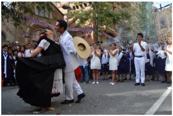 During the 2016 celebration of the Lord of Miracles, this dance was performed at the station allotted to its practitioners (Figure 5) at the intersection of Sant Ramon Nonat Avenue and Cardenal Reig Street. This station was especially peculiar for several reasons. Firstly, its location was quite particular, as it was simultaneously the last station on Sant Ramon Nonat Avenue and the first one on Cardenal Reig Street. As pointed out above, the avenue is the nerve center of the celebration; the stations there are considered to be the most important for the celebrants for national and religious reasons. On the one hand, the stations that begin and end the procession are on this avenue. Additionally, it is at these stations where references to the idea of brotherhood as Peruvians and devotees of the Lord of Miracles (unity) become more evident at the symbolic and ritual level. In fact, it is in this avenue that the emotional excitement of the celebrants manifests itself in the clearest and most general way. However, the scissors dance station was far from being considered one of the most important of the celebration, and no major symbolic references to unity as Peruvian or devout brothers (as is the case with the singing of the Peruvian anthem, the Hymn of the Lord of Miracles, and the Marinera Dance) were made. This station was instead part of a logic of interaction that was closer to that of the stations located along Cardenal Reig Street and was one of the stations least regarded and attended by the bearers along the route. Moreover, only after this station were women allowed to bear the image of the Christ. The station’s transitional location seemed to render it a non-event.