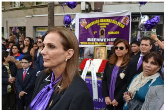 Traditionally, this type of religious festival has been seen as a mere extension of the cults of origin that echo the official Catholic canon, and their internal homogeneity is overestimated (Altamirano 2000; Ruíz Baia 1999; Paerregaard 2008). From our recent ethnographic experiences in the city of Barcelona (October 2016 and October 2017), we were able to discern that the procession of the Lord of Miracles is a complex ritual event in which a series of elements (cultural, religious, ethnic, and national) are blended together and whose logic merits analysis. In the context of our study, we noticed that both the internal similarities and differences of the community are manifested through distinct symbolic and ritual forms.