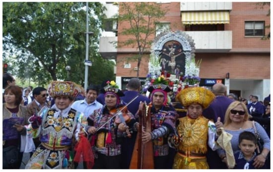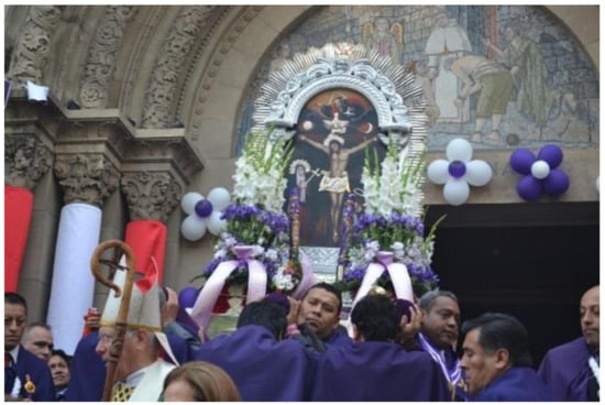 - Paerregaard, Karsten. 2008. In the Footstpes of the Lord of Miracles: The Expatriation of Religious Icons in the Peruvian Diaspora. Journal of Ethic and Migration Studies 34: 1073–89. [Google Scholar] [CrossRef]