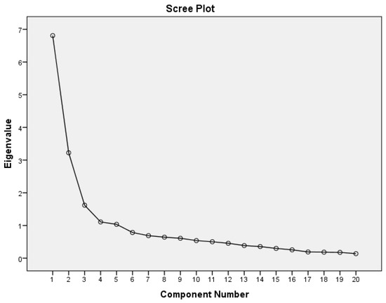 Following the Varimax rotation, the Ideals items loaded significantly on four factors. These four factors had an eigenvalue greater than 1 with an explained variance of 72%. All of the items had a loading range higher than 0.5, above the minimum acceptable value of 0.4. The first factor was related to the communal (1, 3, 8, 17, 19)/personal (9, 14, 16) SWB with one additional item (12) from environmental SWB. The second factor related to the transcendental dimension of SWB and the third factor was for environmental SWB; the fourth factor was associated with personal SWB (Table 3, Figure 1).