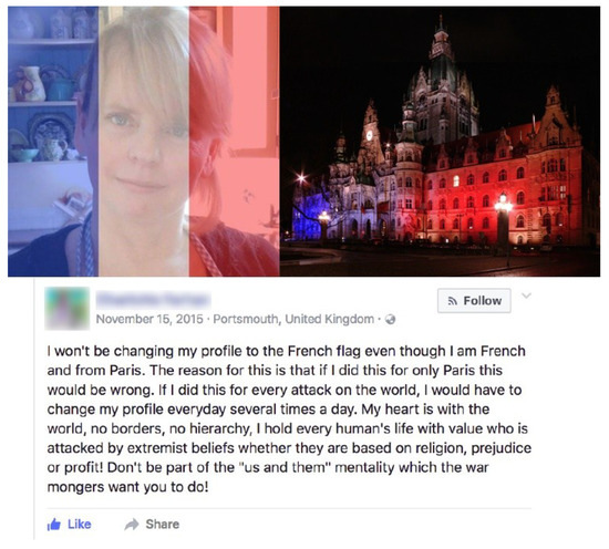 - Lavender, Jane. 2015. Paris Attacks: Why This Woman Won’t Change Her Facebook Profile to France Flag. Mirror, November 16. Available online: http://www.mirror.co.uk/news/world-news/paris-attacks-woman-wont-change-6837570(accessed on 18 May 2018).