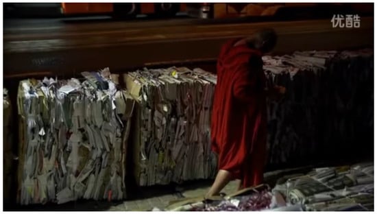Walker is the second and eponymously representative film within Tsai’s “Walker” series, which features the same figure of a Buddhist monk performing walking meditation in diverse locales around the world. Beginning with No Form (2012), the series now also includes Diamond Sutra (2012), Sleepwalk (2012), Walking on Water (2013), Journey to the West (2013), and No Sleep (2015). Walker was officially released as a “micro film” (wei dianying) on Youku, one of China’s leading video-hosting platforms. Other films in the series have been screened as feature-length films, performance art, and video installations in film festivals and art biennales. In collaboration with respective local filmmaking, cultural, municipal communities, Tsai has shot these films in Taipei, Hong Kong, Kuching, Marseille, and most recently, Tokyo, and hopes to continue shooting in major cities across the globe. Besides illustrating the global nature of Tsai’s cinematic production, the “Walker” series reflects the long-standing adaptability of Buddhist media, an adaptability evinced in the oft-neglected fact that a CE 868 copy of the Diamond Sutra (which one of Tsai’s films explores) stands as the oldest extant printed book in the world today ().
