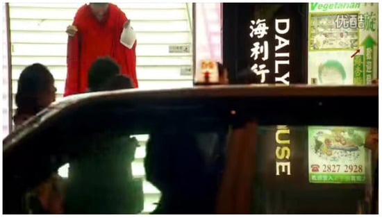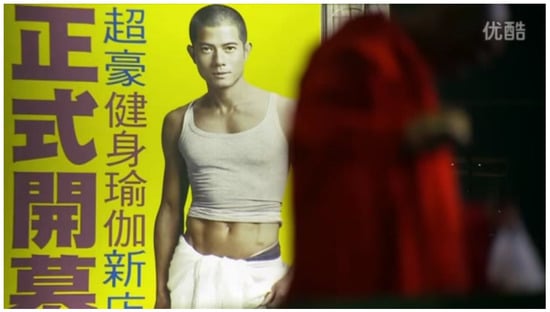 The film’s perspectivism becomes more pointed in the zoom shot that immediately follows (see Figure 7). From being an inconspicuous blip on the screen, the walker starts to fill up to half the screen while moving ever so slowly from the left to the right of the frame. Yet, for the first and only time in the film, he is out of focus; the shallow depth of field keeps the billboard behind him in sharp focus instead. On closer scrutiny (or repeated viewing), it turns out that the billboard is the one that featured in the prior quasi-bird’s eye view shot. We now see that the advertisement announces the opening of the new branch of a trendy yoga studio, and that the buff model is none other than Aaron Kwok, a Hong Kong superstar singer/actor who first rose to fame in the early 1990s. During the opening launch of Beautiful 2012, Tsai explained that while making Walker, one of the perspectives he tried to adopt was that of a local Hongkonger observing things in the city that were interesting (Chi: youqu de) or laden with feeling (Chi: youganqing de), or that may have disappeared or persisted over time (). In this light, it becomes clear the transitional zoom aims to help us observe afresh things that city-dwellers may have grown accustomed to, such as the popularity of yoga in contemporary Hong Kong, or the impressive longevity of Kwok’s career and physique. By ingeniously framing the shot such that (the image of) the artiste and the walker are of the same size, the film evokes the camera tricks of Dziga Vertov’s Man with a Movie Camera (1929), which aim to render “the presentation of even the most ordinary things [with] exceptionally fresh and interesting aspect” (). At the same time, the fact that within the frame the walker is no more “real” than Kwok—both are performers whose images we see via visual media—suggests the Buddhist view of the non-duality between the physical world and its artistic representation.